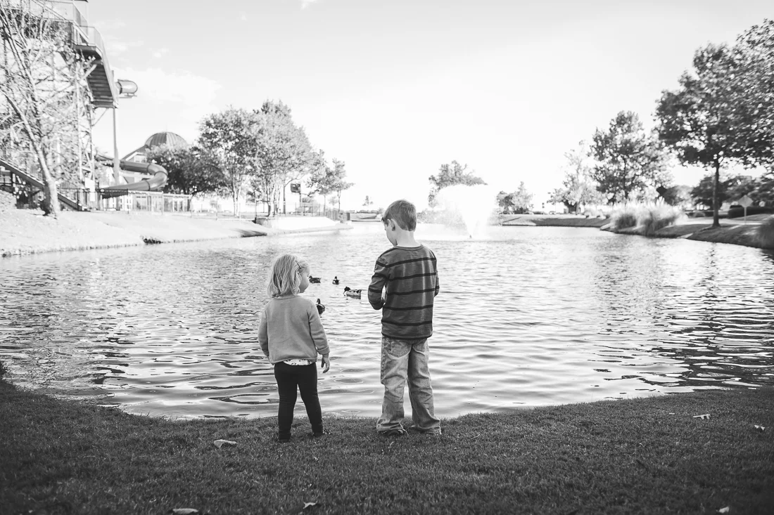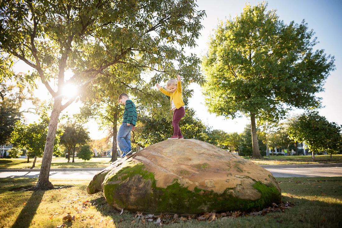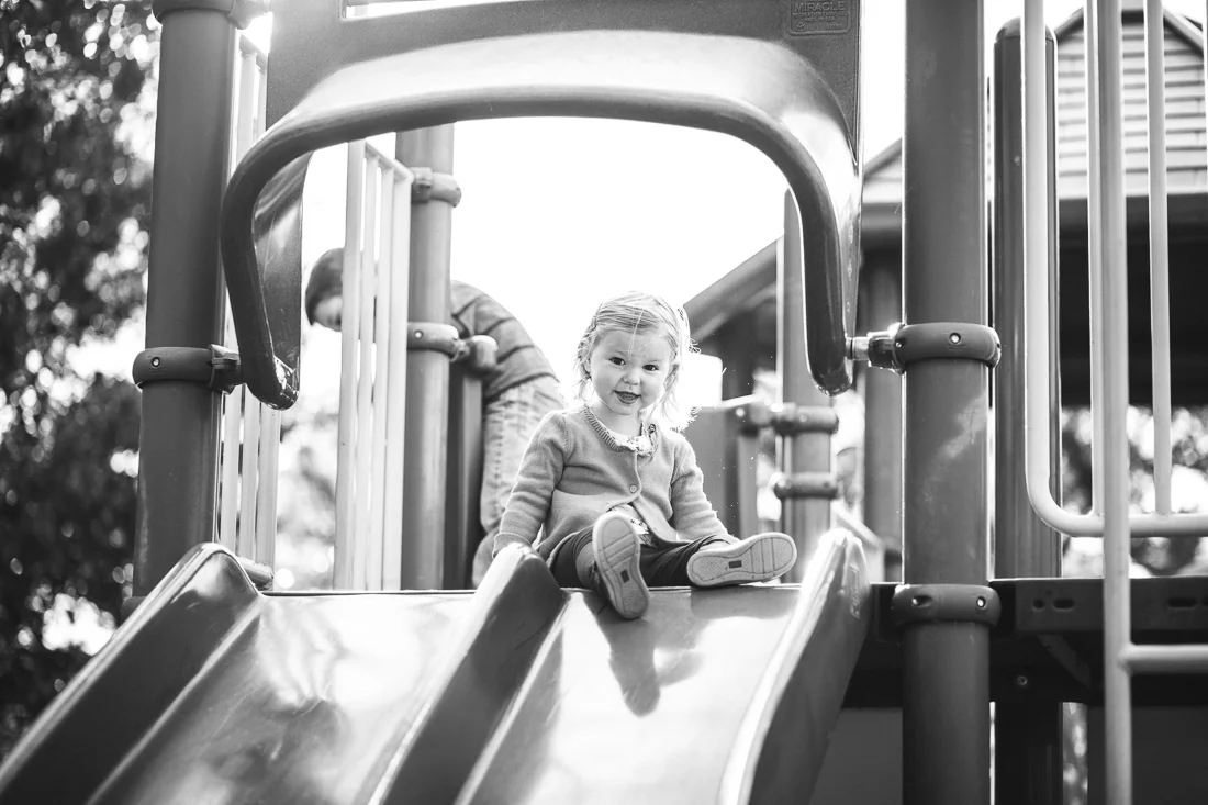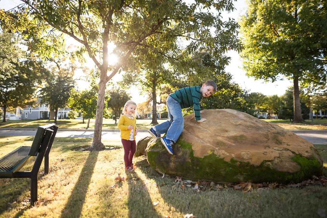Sam and Evie and I stopped by the playground on the way home from school on a pretty fall afternoon last week. Sam found some kids his age to play with, so I didn't get many pictures of him. Evie went from the slide to the swings to the slide to the swings. We got to pet a neighbor's puppy dog and watched the ducks in the pond. They came over to us, hoping we had treats, but unfortunately we came to the park empty-handed. Right before we left, Sam climbed one of the big mossy rocks by the duck pond. Evie was determined to do it just like Sam. Her little legs had to work harder to get up there, but when she finally did, she was very proud of herself. "Yes! I did it!", she said!