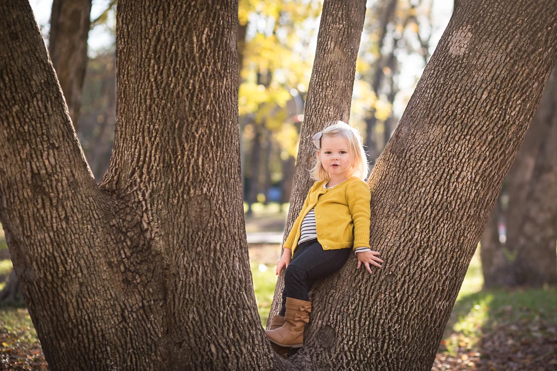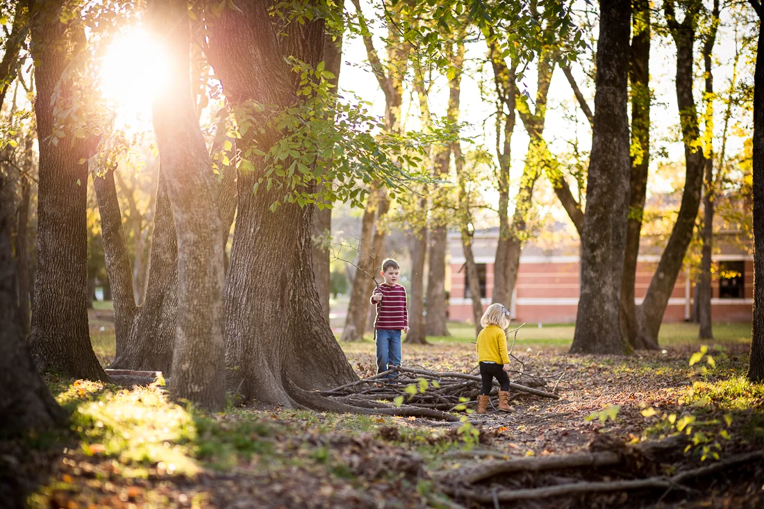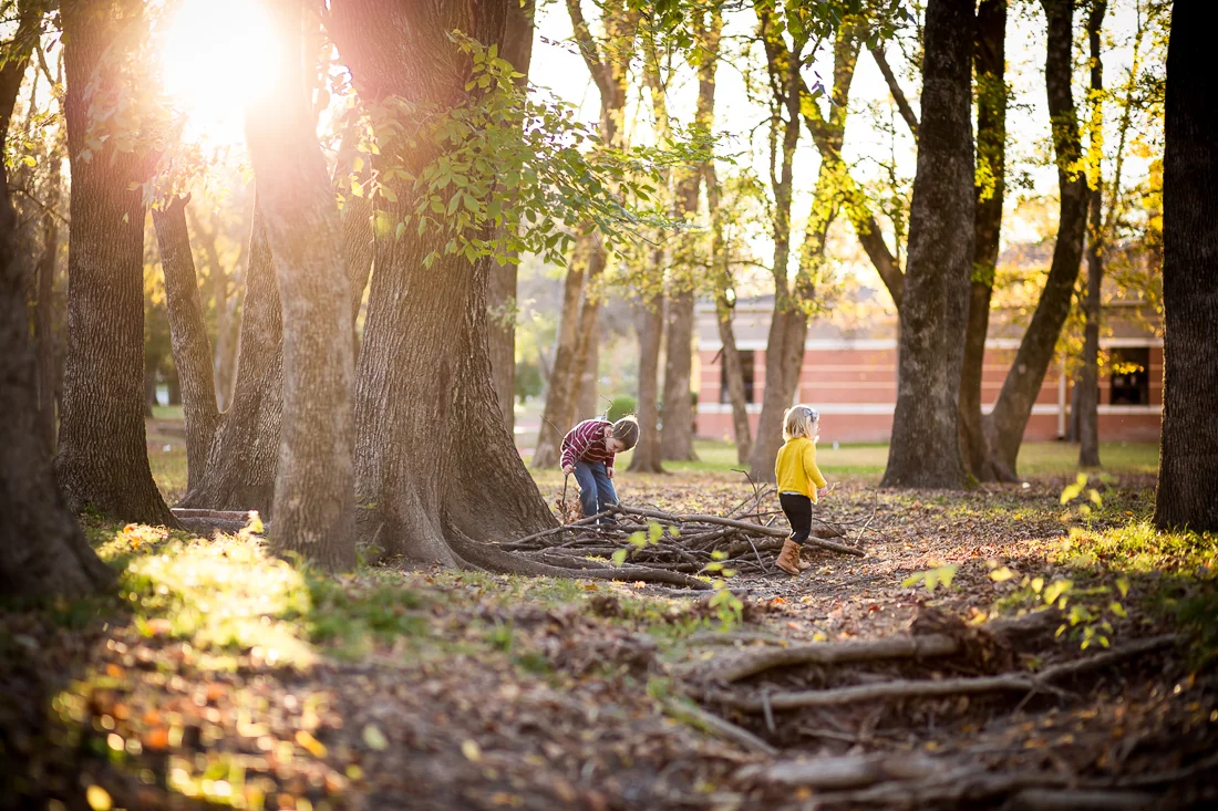 We had a playdate with our photography friends in one of our favorite places. There is a small patch of trees adjacent to an elementary school in McKinney whose leaves have usually turned and started to fall this time of year. Each November our playgroup meets here for an afternoon of pictures while the kids play in the leaves and on the playground. This year the leaves weren't as thick as they've been in the past, but we made it work. What was fun for Sam and Evie this year was climbing in the trees, standing on tree stumps, and dragging branches into a big "nature collection" as Sam described it. Here they are, working hard in the nature, playing in the pretty afternoon light.