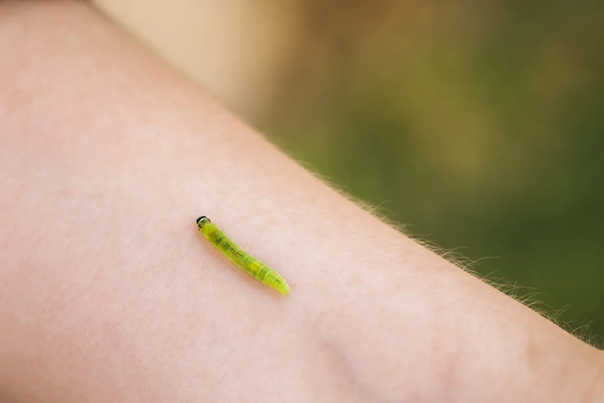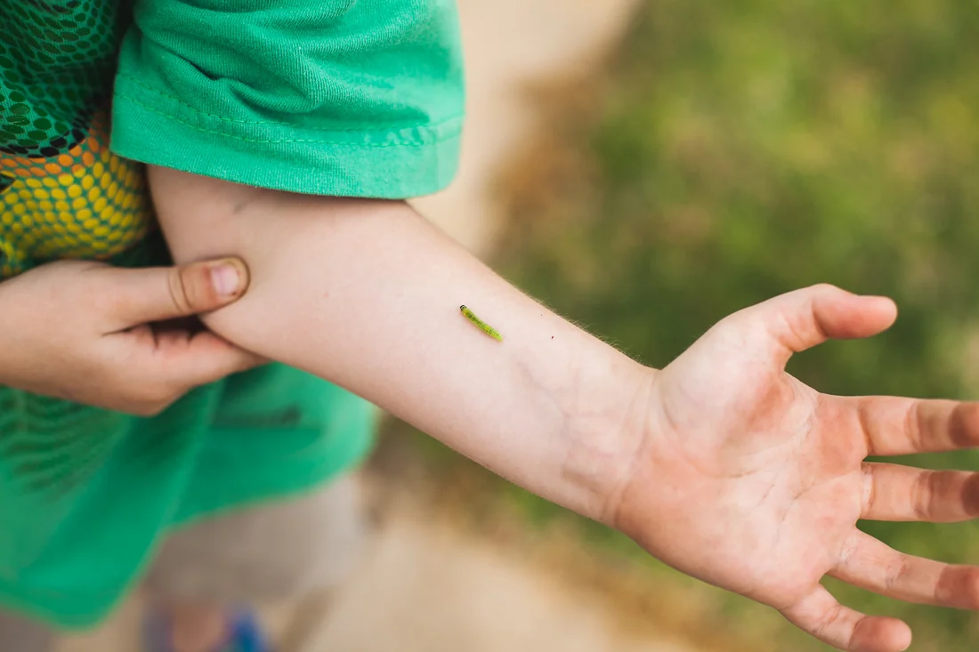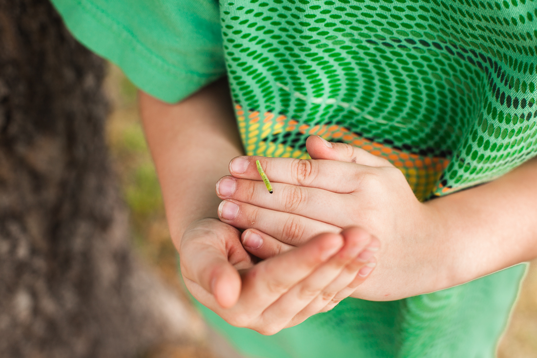 Sam found this little green guy when we were working in the yard.  He was very tiny and oh so green!  After watching him wiggle around for a while Sam and I collected some grass and acorn tops and put them all in our bug box so we could watch him play!