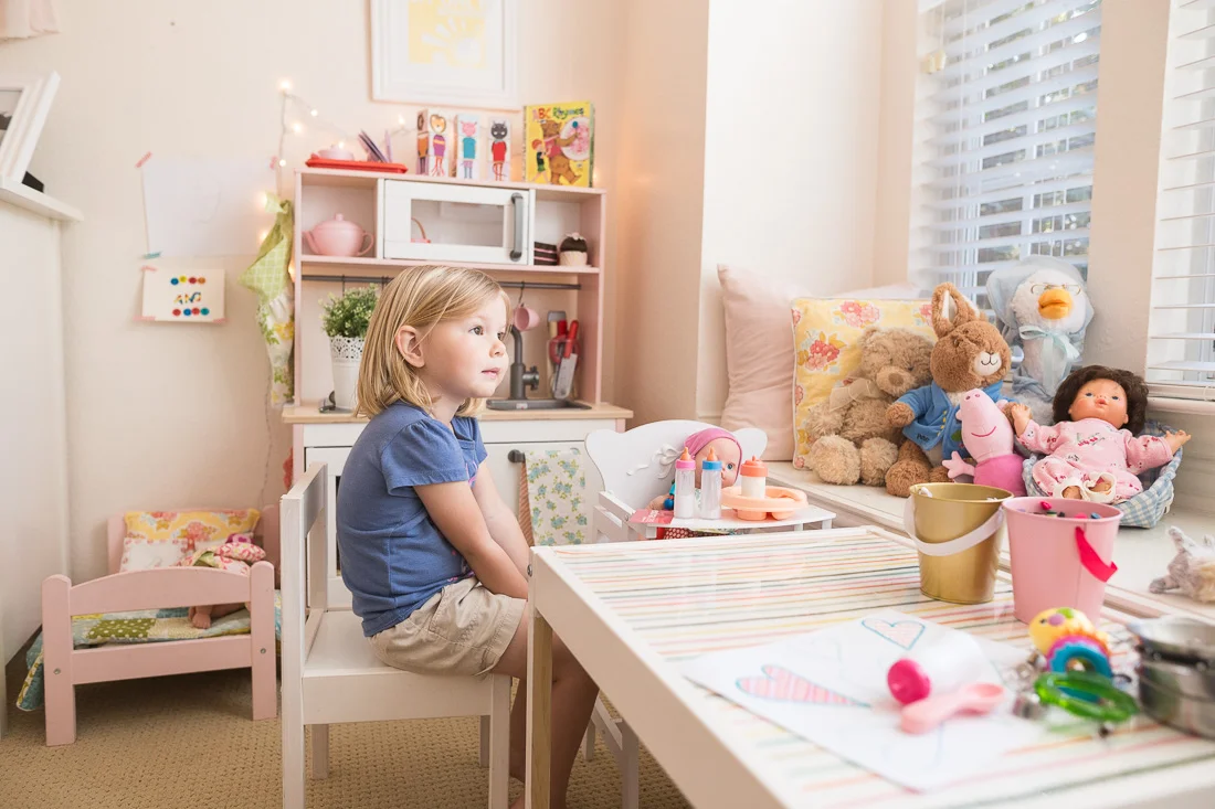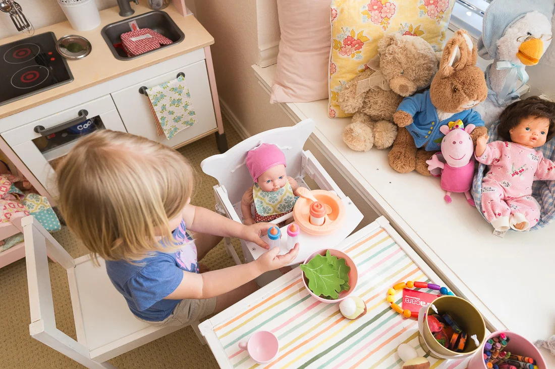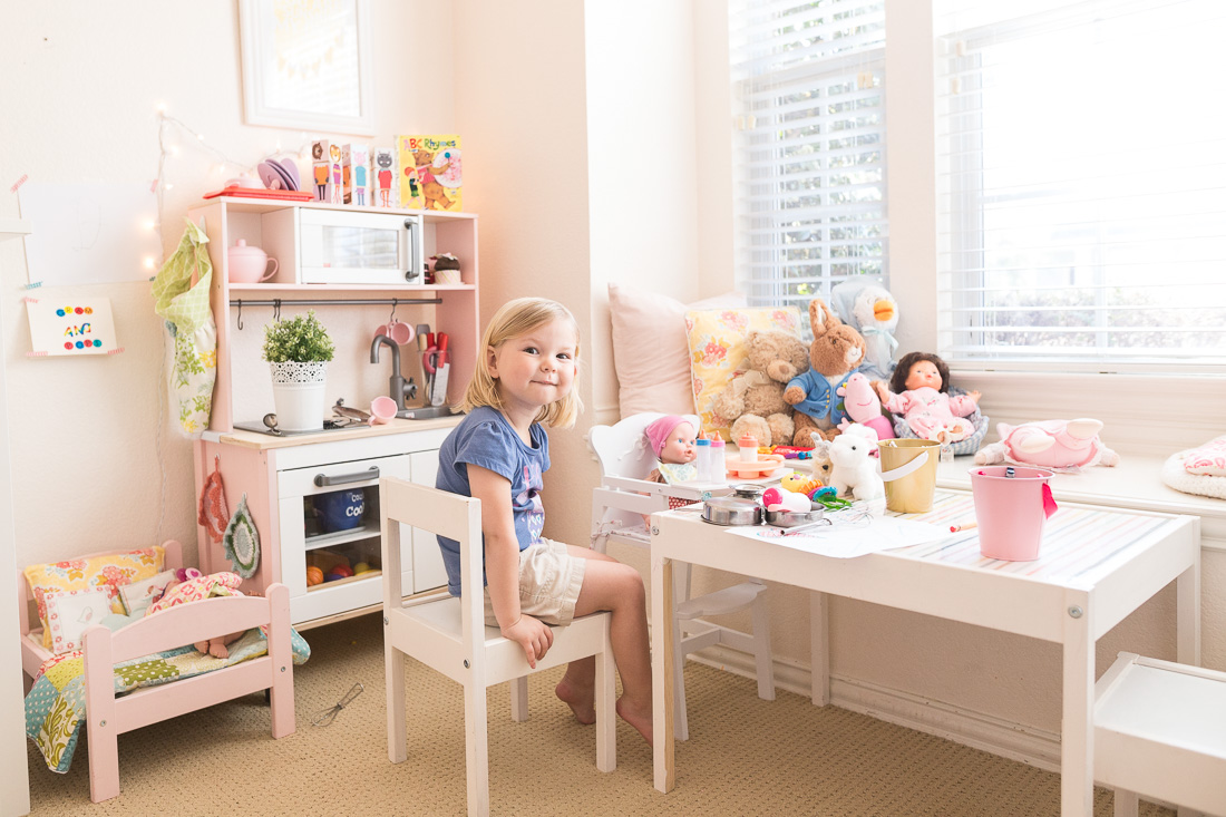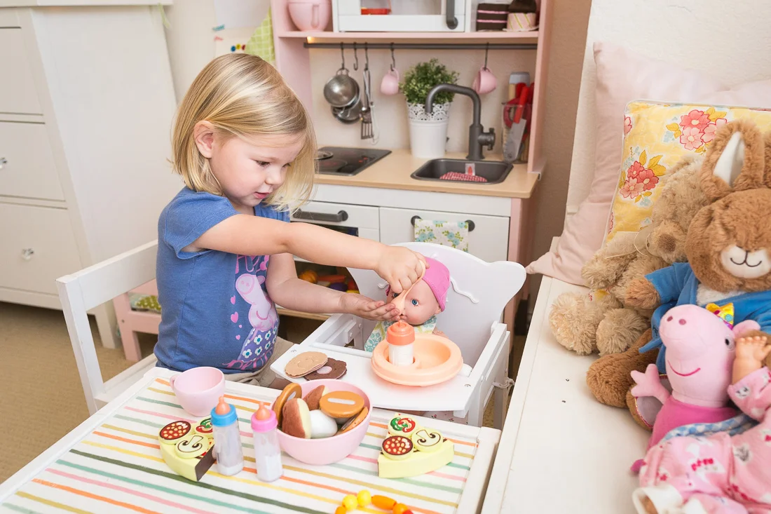 Here we are on a Saturday morning, feeding her baby doll many things, including mushroom salad and chocolate chip cookies. Mmmm!