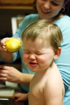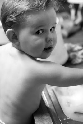 He's likes to "wash dishes", which means washing his toys in the bubbles, and loves to take a whiff of everything I chop, measure and stir. He pretended not to like this lemon..."eww" he said...but I know he didn't really mean it!