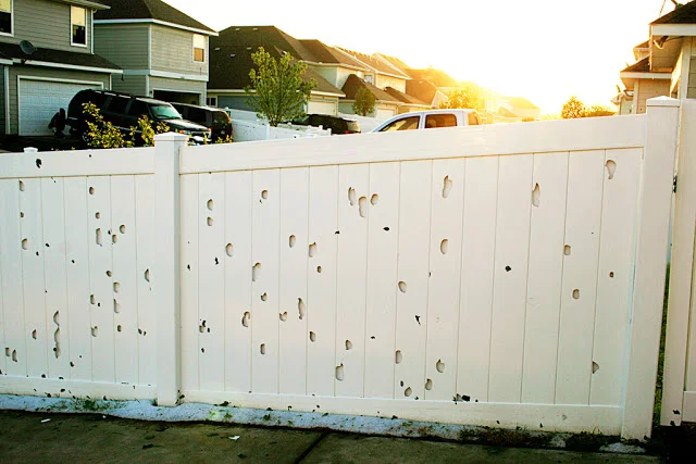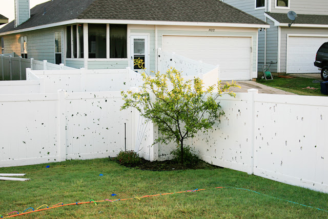 The next morning we surveyed the damage. Our bedroom window was broken, our cars dented, my windshield cracked. The flowers were smashed - the leaves that managed to hang on looked chewed-up and the stems were banged up. And the fences - oh the fences! Surprisingly, only one flower pot was smashed, and Sandbox-Turtle made it through without a ding! There were leaves, flowers, glass, plastic and roof pieces everywhere. The sidewalks crunched as you walked! Neighbors reported hail smashing through windows, through wood blinds, and down hallways. One neighbor told us she was up collecting a bucket's worth of hail from her spare bedroom at one in the morning.