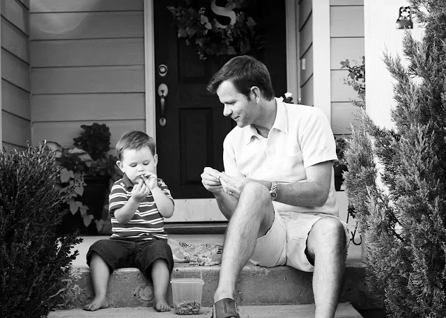 One of his favorites is the time he spends with Brian in the evenings. After Brian comes home from work, while I start cooking dinner, he takes Sam out on the porch and they eat peanuts. It started last spring when I went to the Dallas Farmers Market and brought home a bag of peanuts for Sam. He loved them and we've been buying them ever since. They sit on the steps, shell peanuts, and talk about their days. Before going out, Brian always gets a tupperware container for the shells and they say together "It's gonna get messy!"