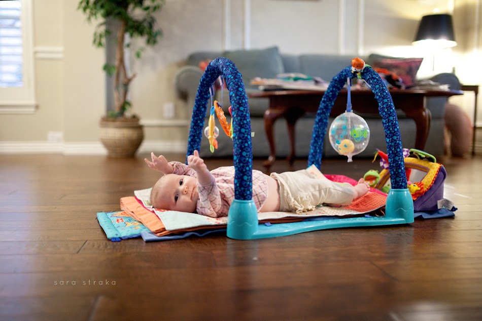 Evie played in Gram and Pops' workout gym yesterday. She kicked and cooed and worked pretty hard. We have one of these at home but haven't set it up for her yet, so this was her first time playing with all these toys and sounds around her. We're pretty sure she figured out how to whack the fish on the left and she stared at her reflection in the mirror for quite a while, too.