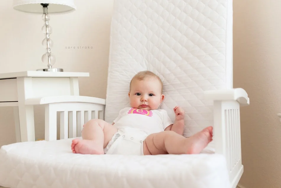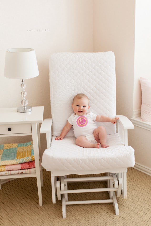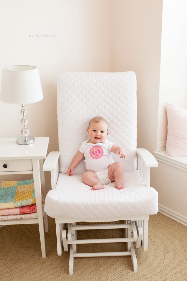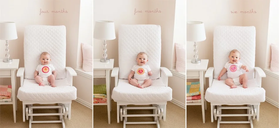 You were a bit wiggly during your photoshoot this month. I'm starting to wonder how the next few months' chair photos are going to look! This was the first month you were really interested in the sticker on your onesie. I had to snap these quickly because it wasn't going to last long!