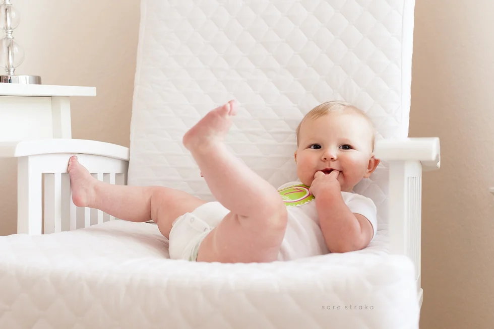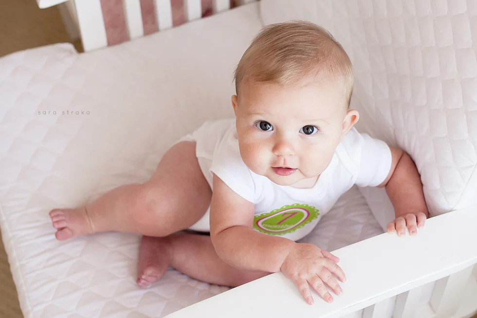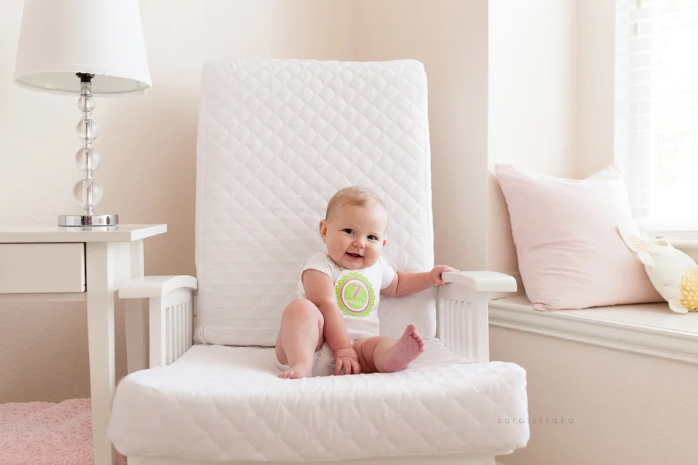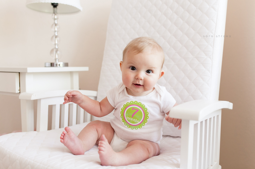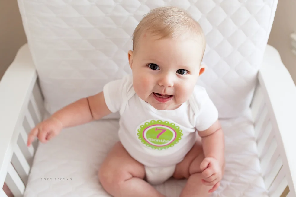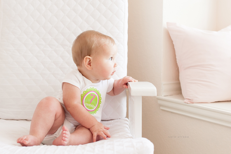 Your biggest accomplishment this month was learning how to sit up all by yourself. It just clicked for you one day, and you've been a good sitter-upper ever since. Within a week of figuring out how to sit up, you started army-crawling and you're all over the place. I know your seventh month will be the month you start crawling on all fours. I was glad to be able to photograph you sitting up in your crib this month. Looks like Daddy will have to lower the mattress now!