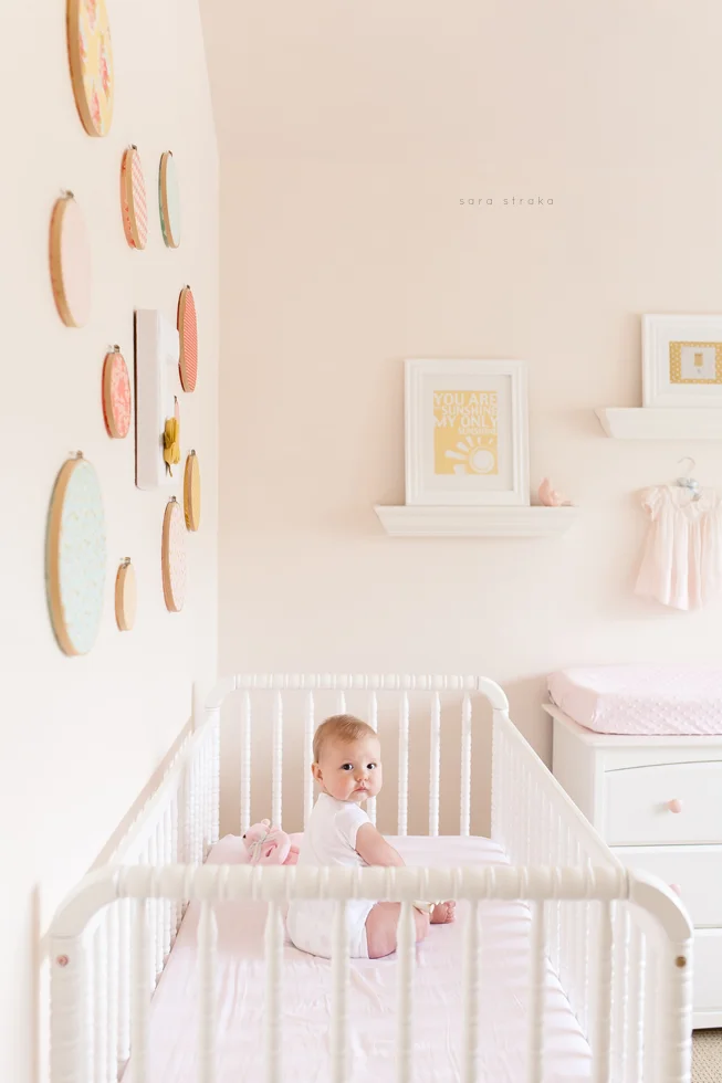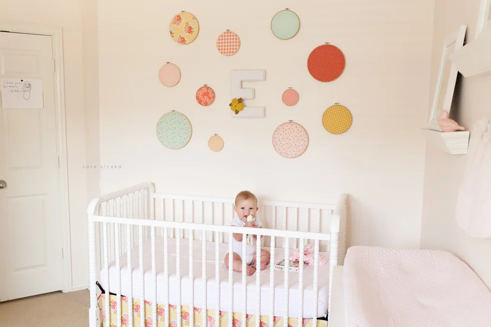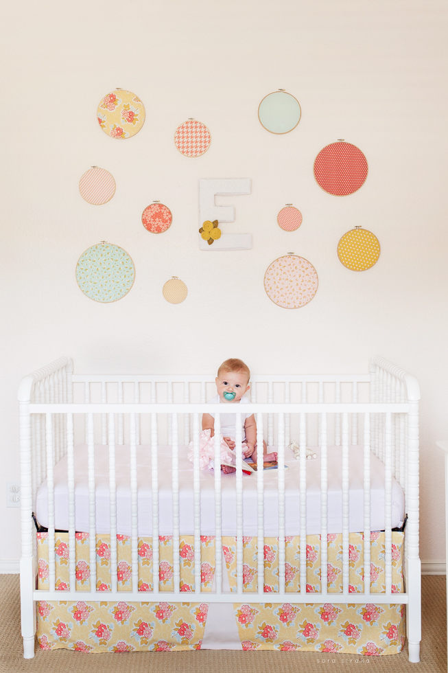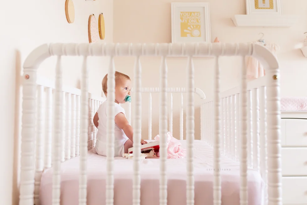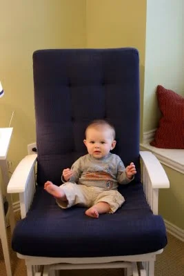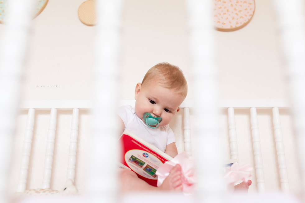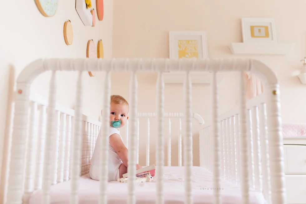 Your biggest accomplishment this month was learning how to sit up all by yourself. It just clicked for you one day, and you've been a good sitter-upper ever since. Within a week of figuring out how to sit up, you started army-crawling and you're all over the place. I know your seventh month will be the month you start crawling on all fours. I was glad to be able to photograph you sitting up in your crib this month. Looks like Daddy will have to lower the mattress now!