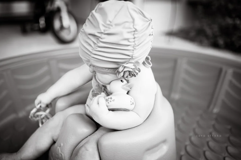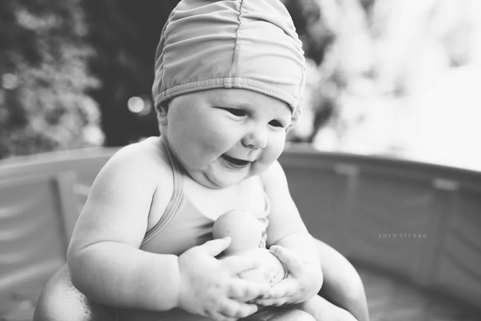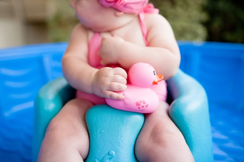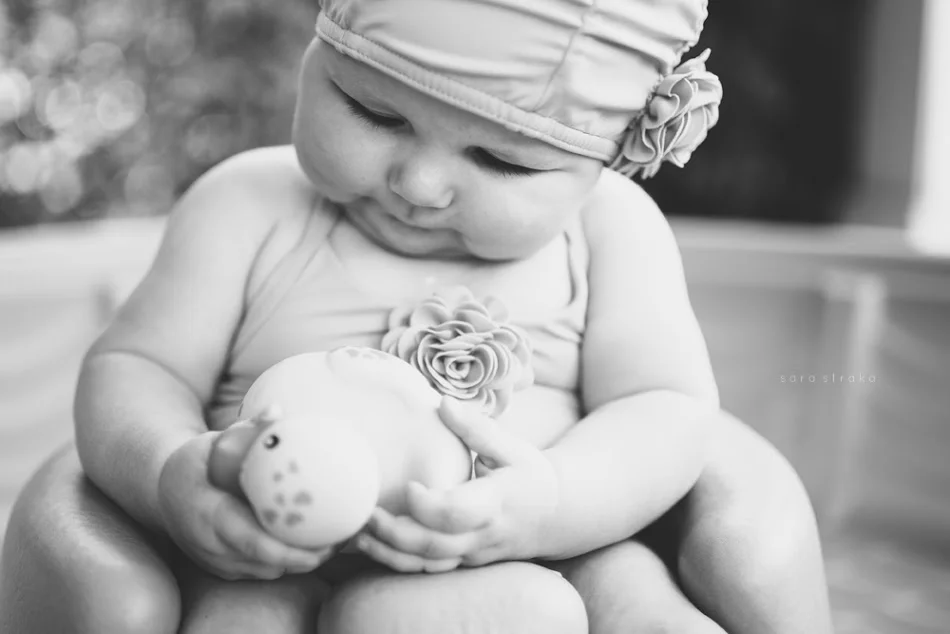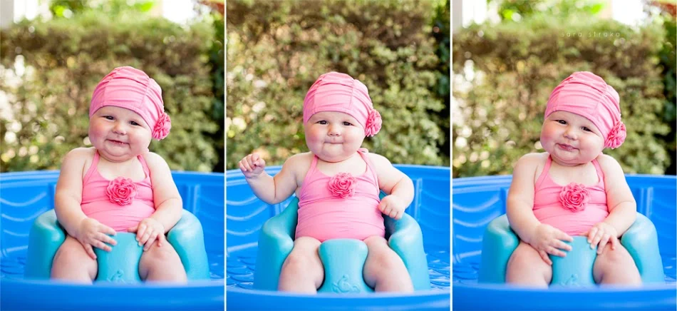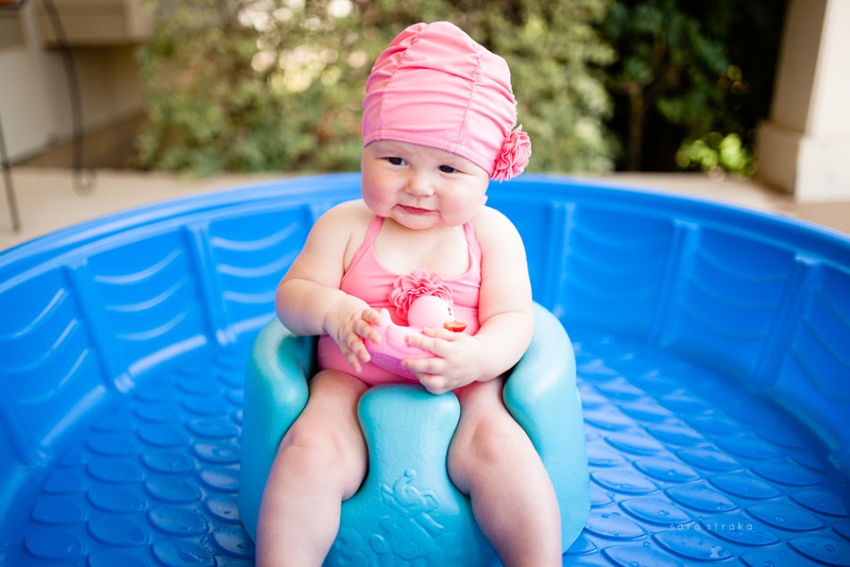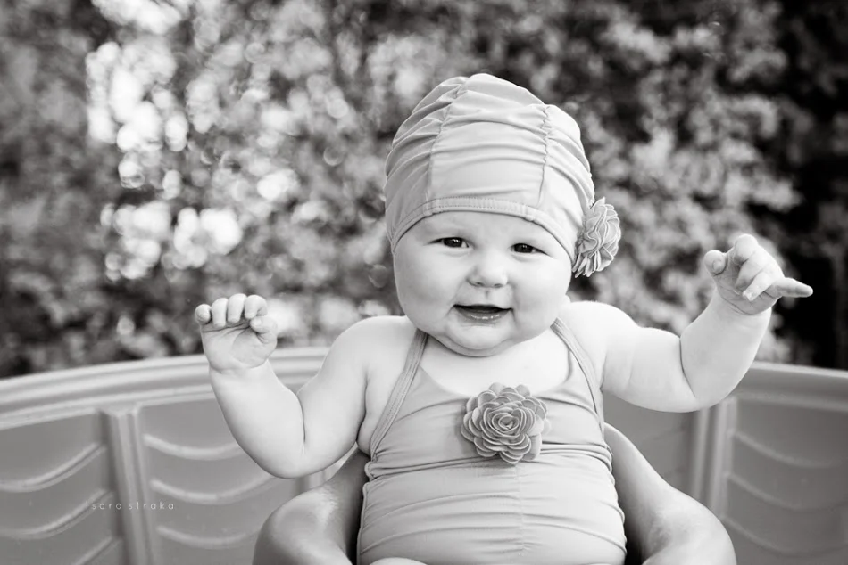 I bought this suit for Evelyn the day we found out we were having a girl. It was on sale at Janie & Jack; the matching swim cap, too. Knowing she would be six months old on May 21st, I got a size 6-12 months.