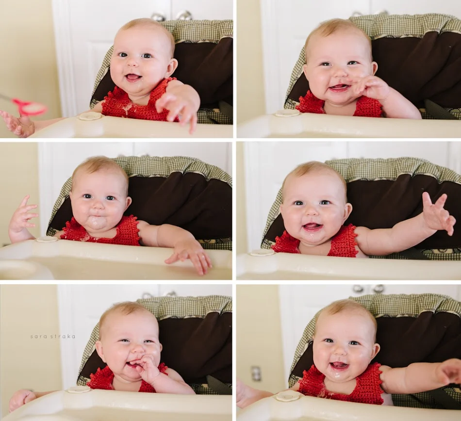 She sort of liked it, though most of it ended up on her bib or her tray. She likes to grab the spoon - that was a surprise! I love all of the expressions she makes while eating. Such a happy girl!