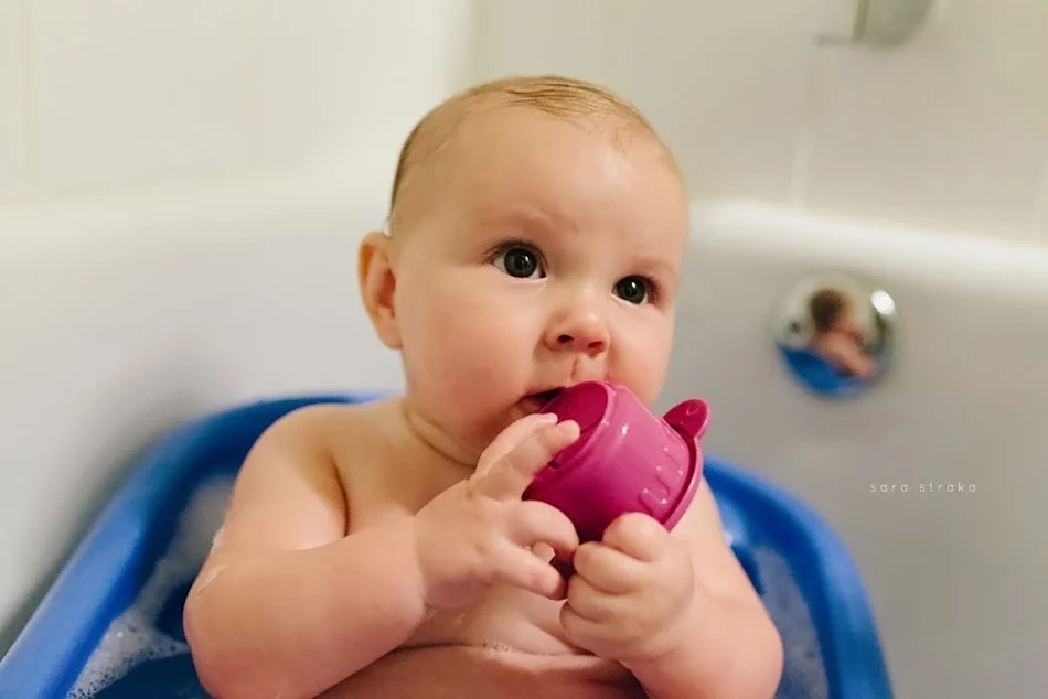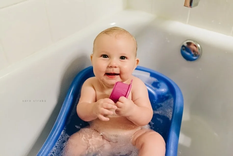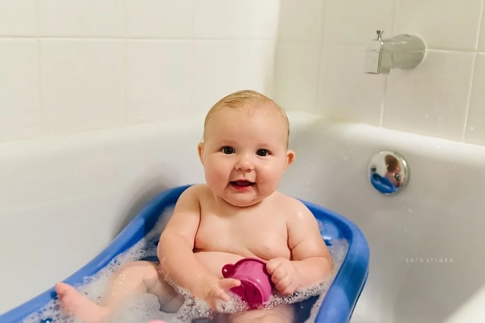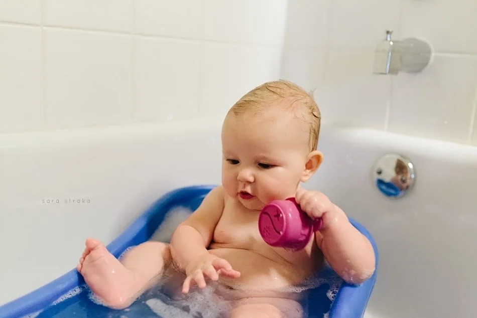Evie's first bath in the blue baby tub! She was overflowing in her newborn tub the hospital gave us. I'd put her in, she'd displace all the water, and then her arms and legs would hang over the side. This is much roomier, with lots of water for splashin'!