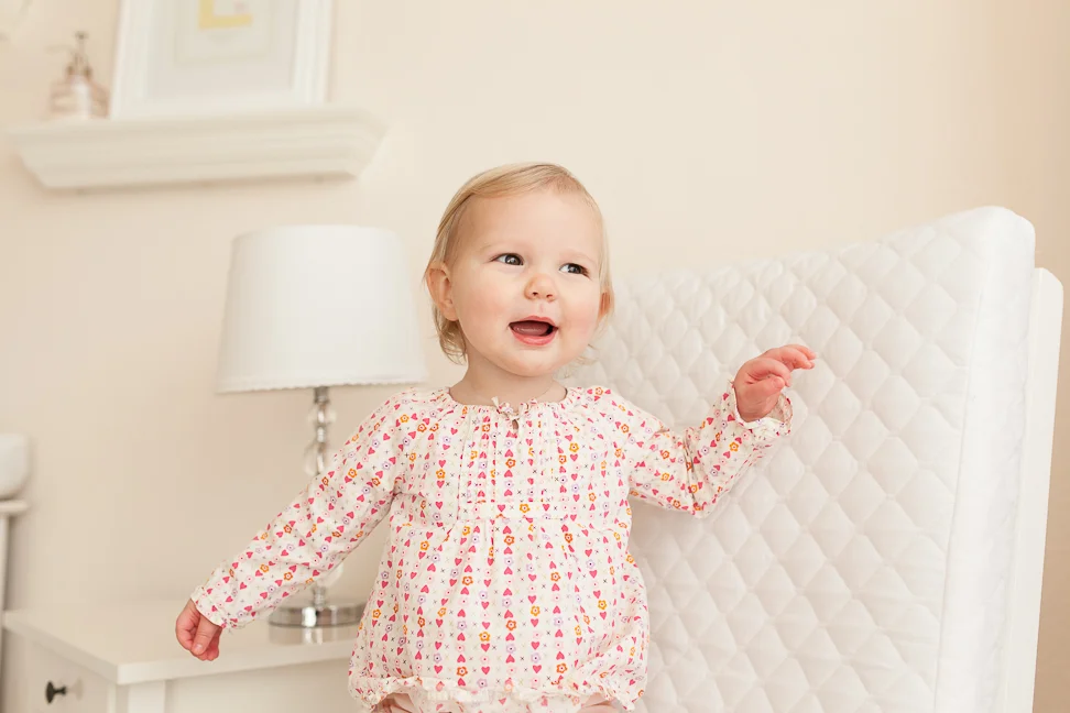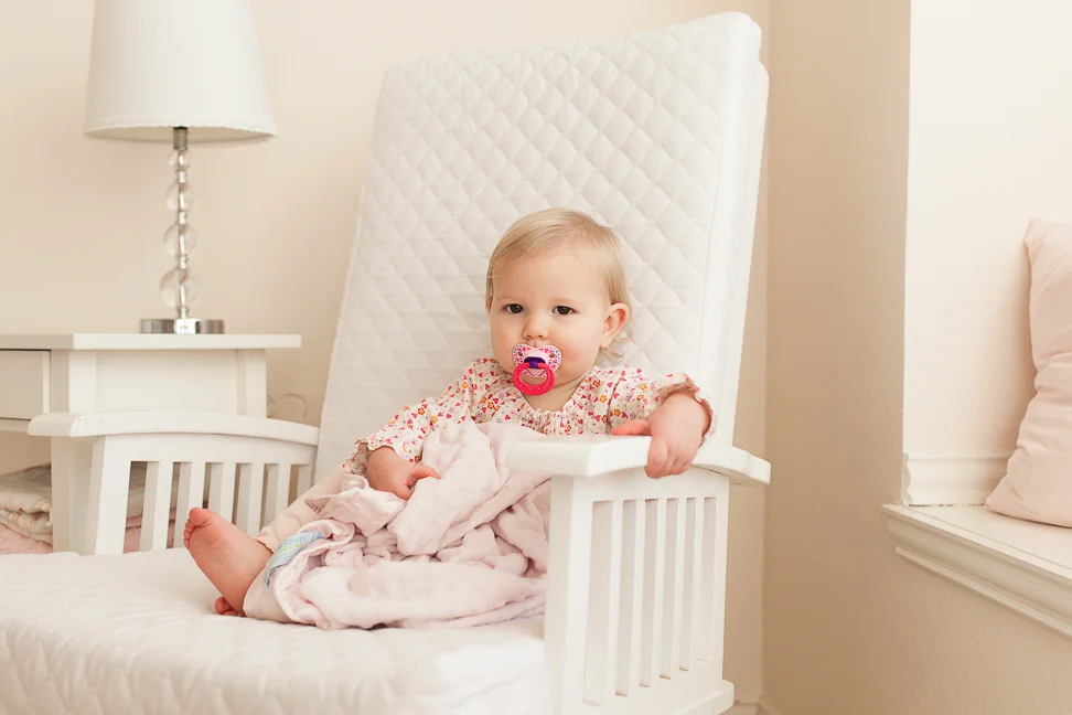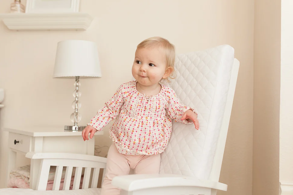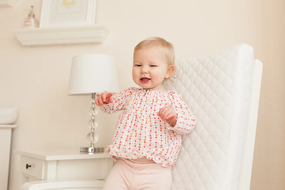 I got some unusual expressions this time. You were all. over. the. place in this chair! But you've been wiggly for a long time. You are a very, very active little girl. You were also rather tired during our photo session. You kept asking for blankie and bunny so you could snuggle them. I'm glad they made it in the pictures with you.