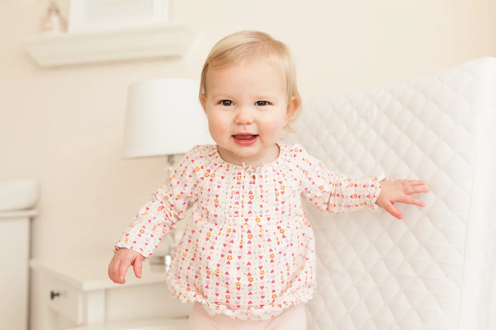 Sleeping - You're teething in spurts and those nights are rough; otherwise you go down easy. You're in bed by 8:00 and you usually sleep until around 7:00/7:30. You're still taking two naps unless you go down late for the first one, which often happens after we've been at a playdate or running errands.