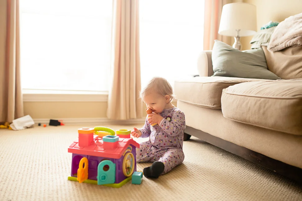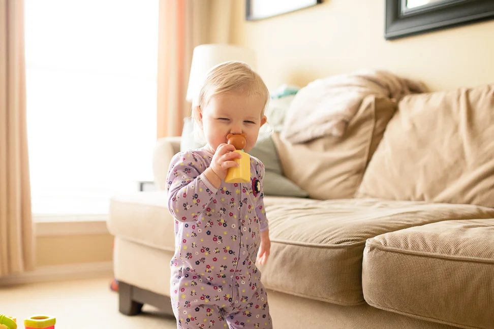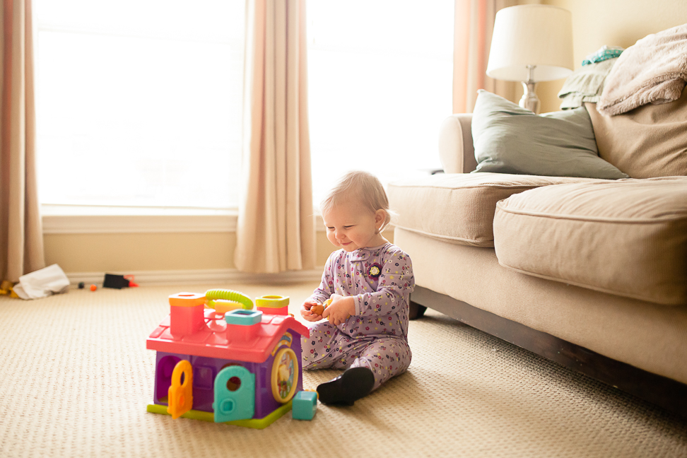 Evie brings me her shoes all the time and asks me to put them on for her. On this particular morning she was wearing footie jammies and her regular shoes wouldn't fit, so we grabbed a pair of Mommy's old mary janes that I was saving in her closet. They did the trick and she loved the way they clicked on the kitchen floor..